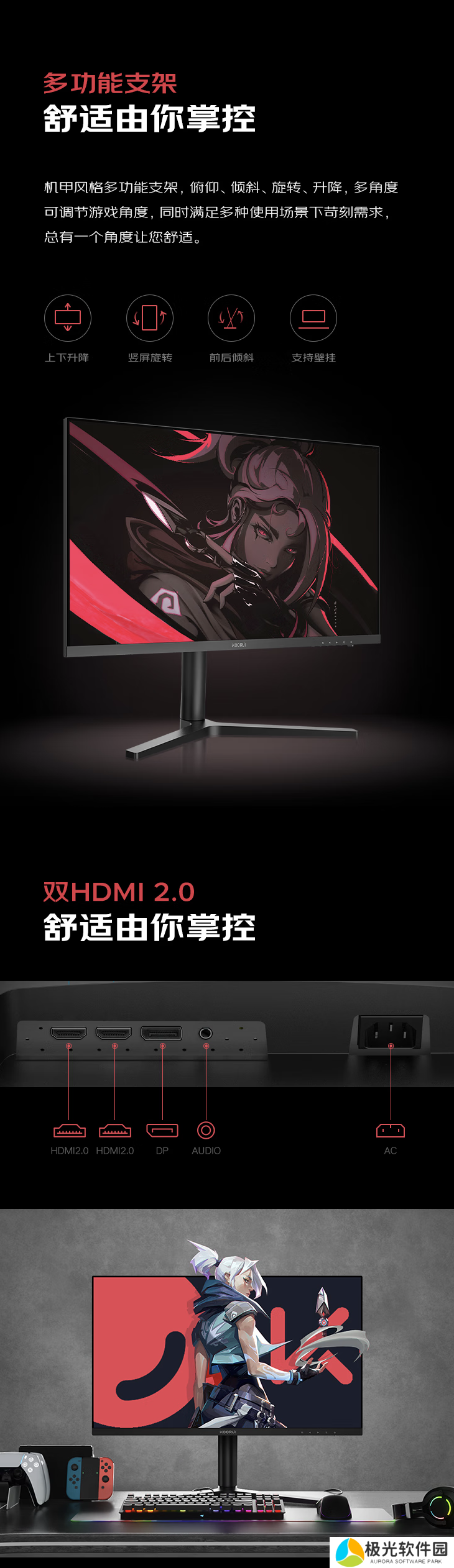 这款显示器支架支持倾斜 / 升降 / 旋转,显示器本体支持 VESA 75x75mm壁挂,提供2个HDMI 2.0接口、1个 DP 1.2接口、1个3.5mm音频接口。