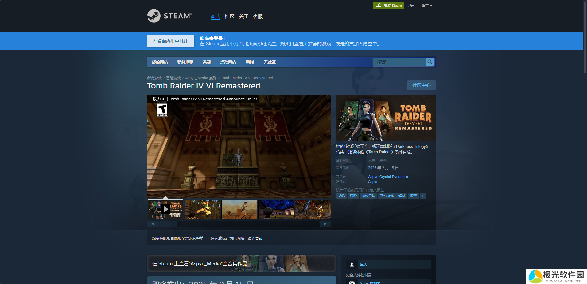 Steam平台需要先安装Steam平台,之后注册一个账号登录,然后搜索“Tomb Raider IV-VI Remastered”进入商店购买页面。