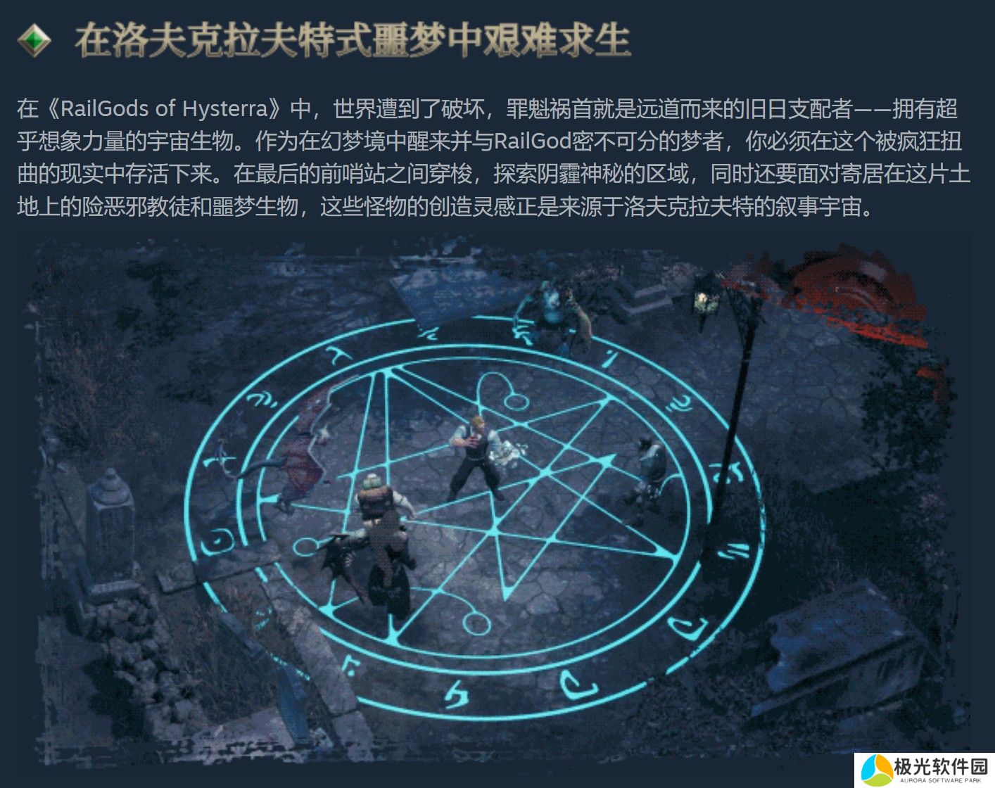 故事讲述整个世界遭受拥有无尽力量的宇宙生物「旧日支配者」摧毁,自梦境国度甦醒的玩家,将利用名为「RailGod」的怪物火车探索邪教徒、梦魇生物肆虐的阴郁神祕大地,于不同的哨口间四处穿梭,试图在已然疯狂扭曲的现实中生存。
