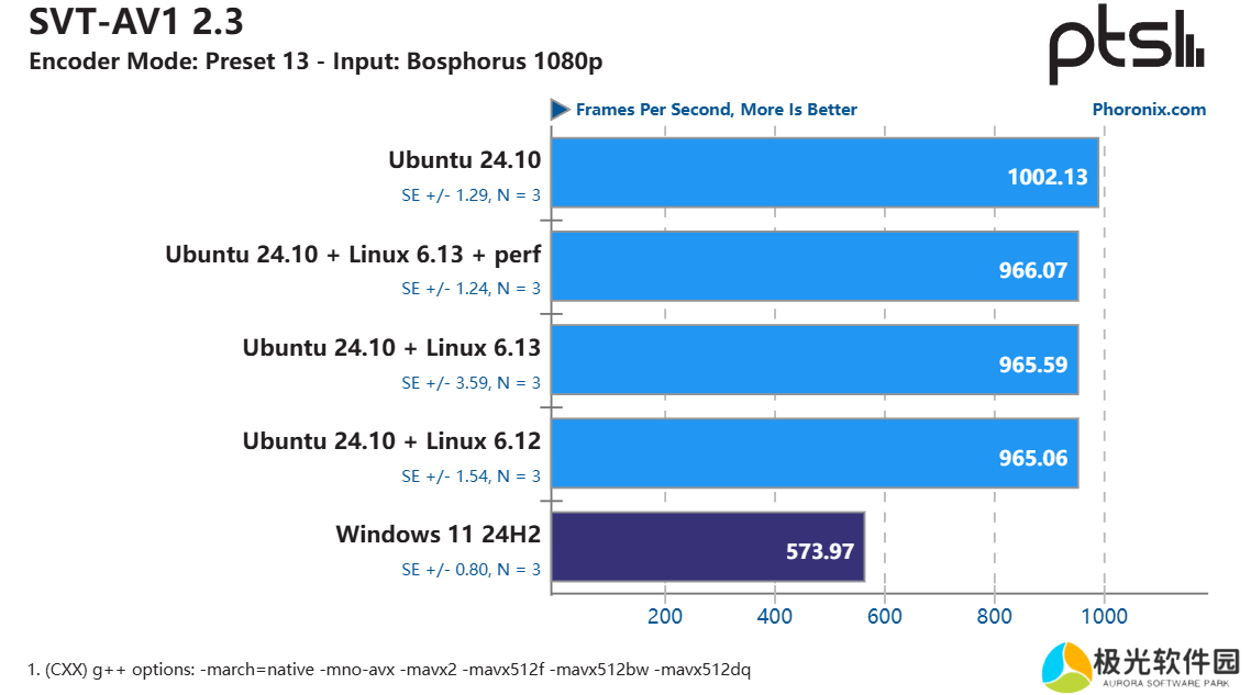 在使用 SVT-AV1 程序的编码测试中,285K 在 Ubuntu 上的速度几乎可以说是 Windows 上的两倍,而其他基准测试在切换到 Ubuntu 后也出现了两位数的性能提升。