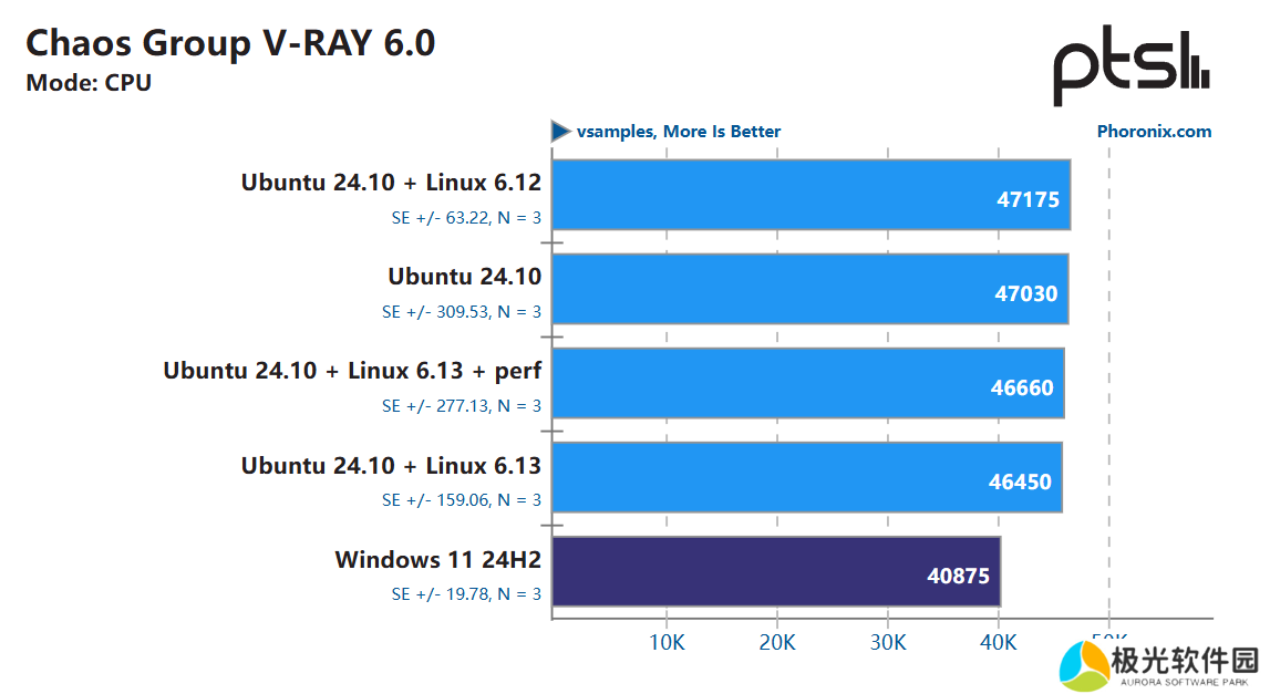 测试结果显示,285K 在 Windows 上确实存在一些问题。这款 CPU 在渲染、光线追踪、压缩、解压缩、编码、Java 以及国际象棋方面的表现不如 Linux。