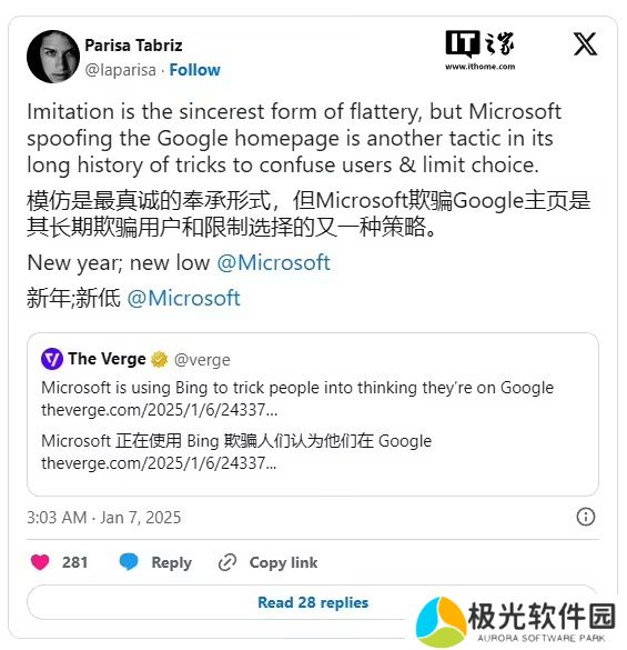 而在此之前,谷歌 Chrome 副总裁 Parisa Tabriz 曾于本月初罕见地公开指责微软,甚至直接在社交媒体上 @了微软,称其欺骗用户,非常 Low。像这样高级别的员工就此类尚未证实的指控发表评论的情况并不常见,其表态也被视为谷歌对微软此举的不满。