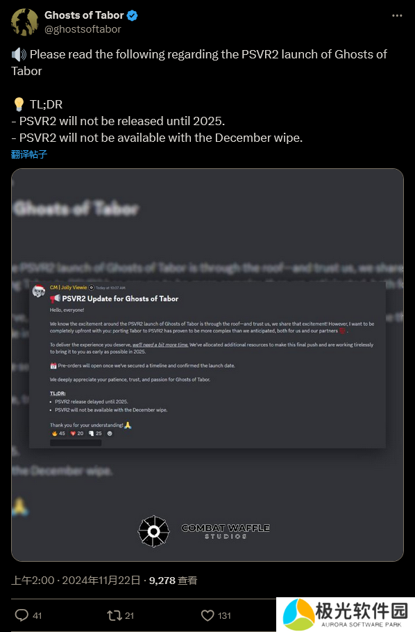 在社交媒体上的一篇帖子中,开发者对延期进行了解释,写道:“我们知道《塔博尔幽灵》在PSVR2 上即将在发布令人兴奋不已- 相信我们,我们也有同样的兴奋!然而,我想完全坦白地告诉大家:事实证明,对于我们和我们的合作伙伴来说,将《塔博尔》移植到PSVR2 比我们预期的要复杂得多。”