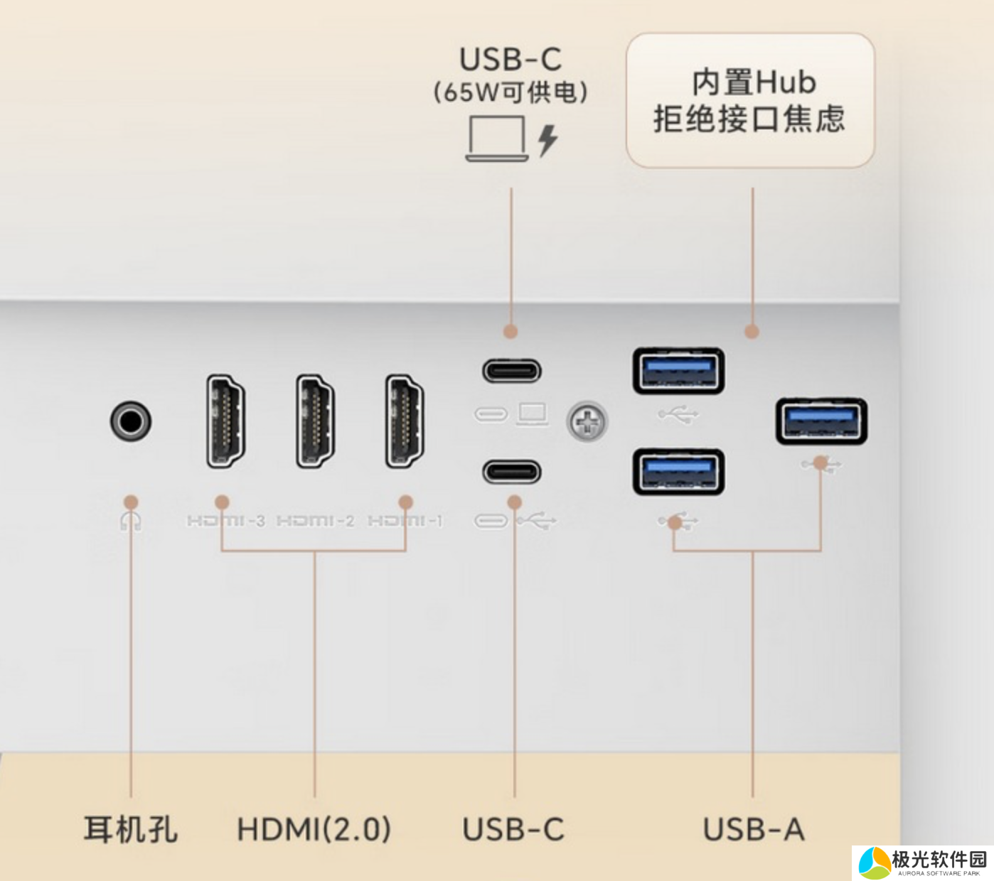 这款显示器支架支持倾斜 / 升降 / 旋转,显示器本体配有 2 个 5W扬声器,支持VESA 100x100mm壁挂,配有 3个 HDMI 2.0接口、2个 USB-C接口-3个 USB-A接口、1个 3.5mm音频接口。