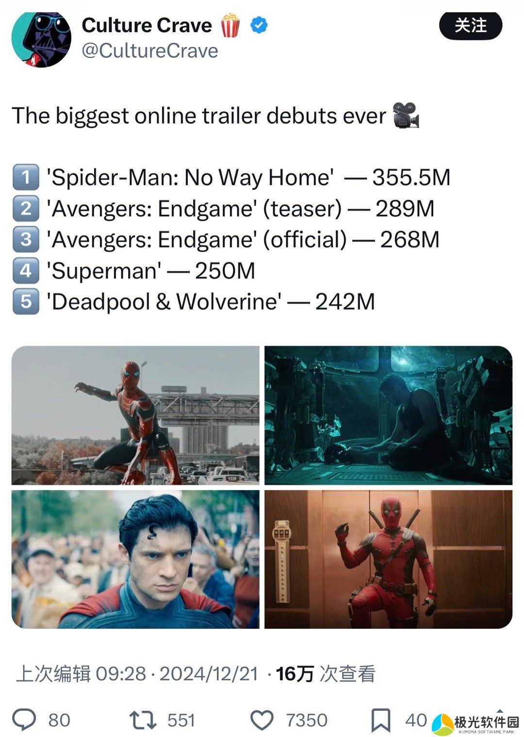 2.5亿是个什么概念?这意味着《超人》先导预告片取得了历史第四高的24小时线上浏览量,仅次于《复仇者联盟3》、《复仇者联盟4》、《蜘蛛侠:英雄无归》,超过了《死侍3》。