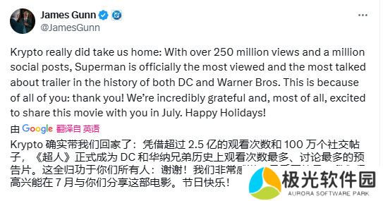 近日,DC影业联合总裁詹姆斯·古恩发推,庆祝《超人》先导预告观看量超过了2.5亿,社媒发帖超过百万,成为DC和华纳兄弟公司有史以来浏览量和讨论量最多的预告片。