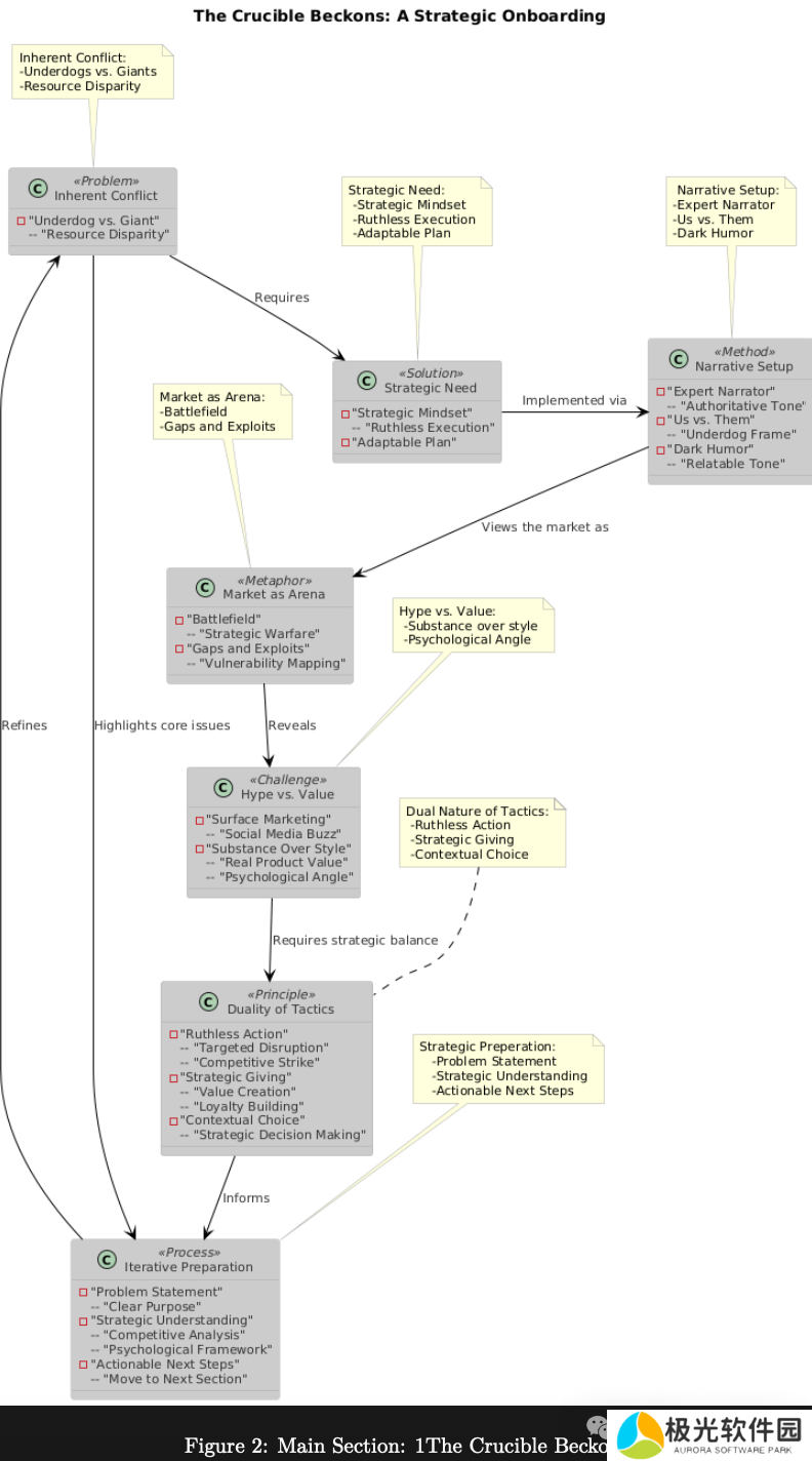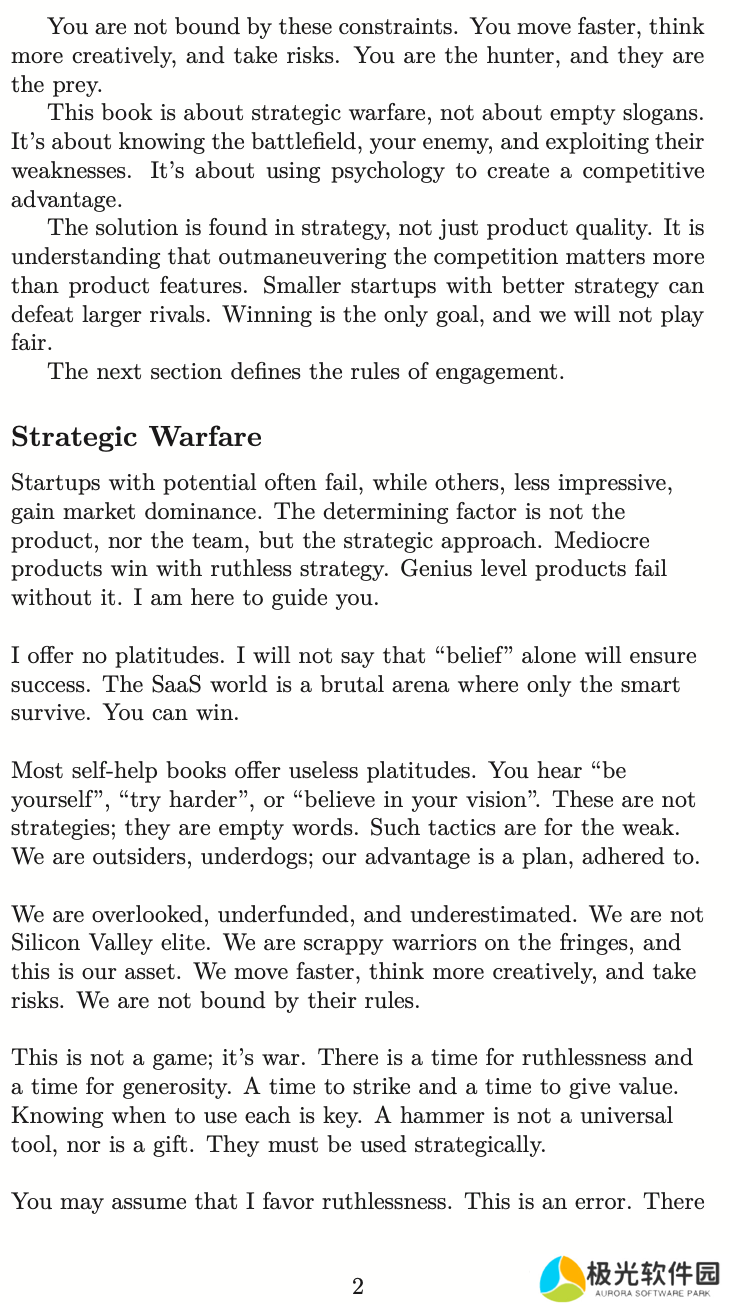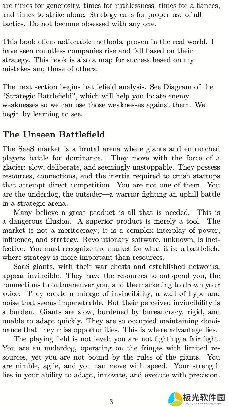 本章节作为 SaaS 初创公司战略世界的引言,通过一个引人入胜的开篇立即抓住读者的注意力,确立了资源匮乏的初创公司与行业巨头竞争的核心问题。它为本书定下了严肃的战略指南基调,同时带有一些黑色幽默,突显了“我们对他们”的心态,并提醒冲突的双重性。