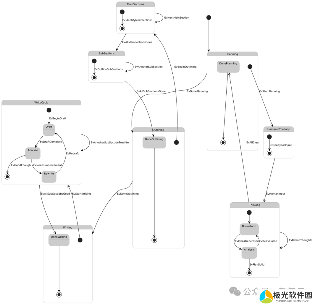 比如在每一个写作周期(writeCircle),都包含了起草、分析和重写 3 个节点,而每个节点都是独立的系统。