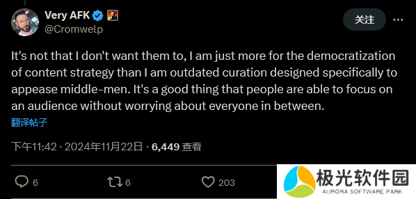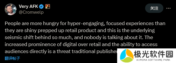 在后续的帖子里,他表示自己并不是希望发行商失败,而是希望未来发行商的策略更加基于玩家,而不是“专为取悦中心人而设计的策划”。