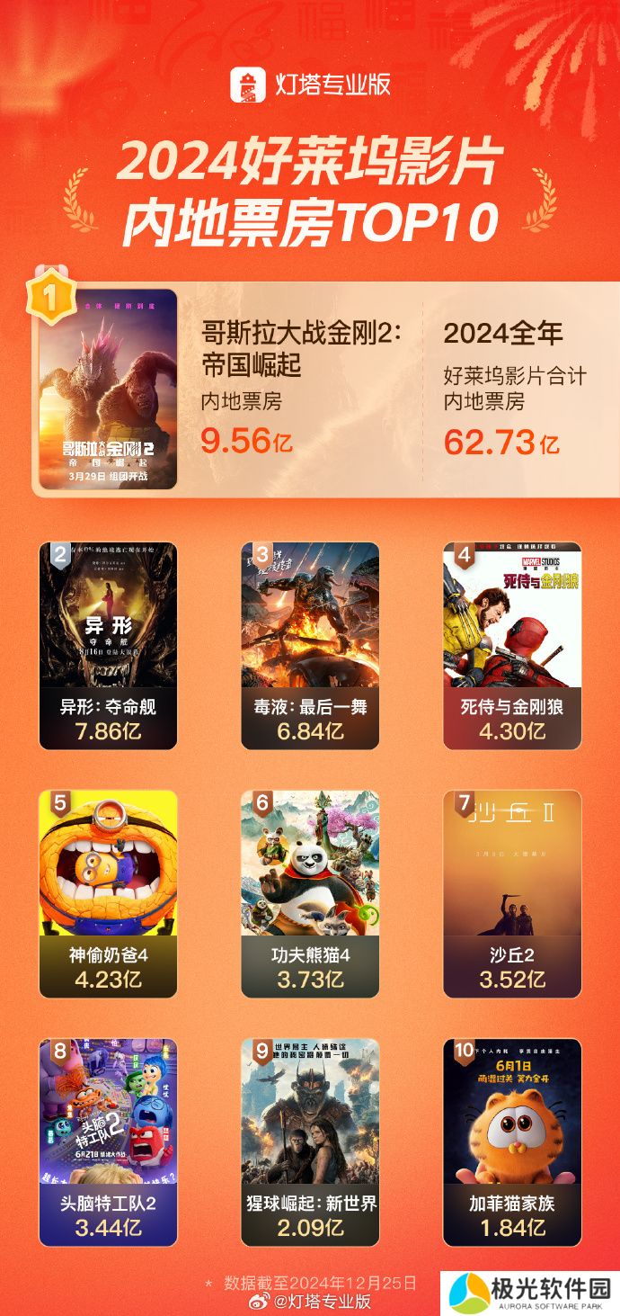 本站 12 月 27 日消息,据灯塔专业版,2024 年好莱坞影片合计内地票房为 62.73 亿元。本站附 TOP10 名单: