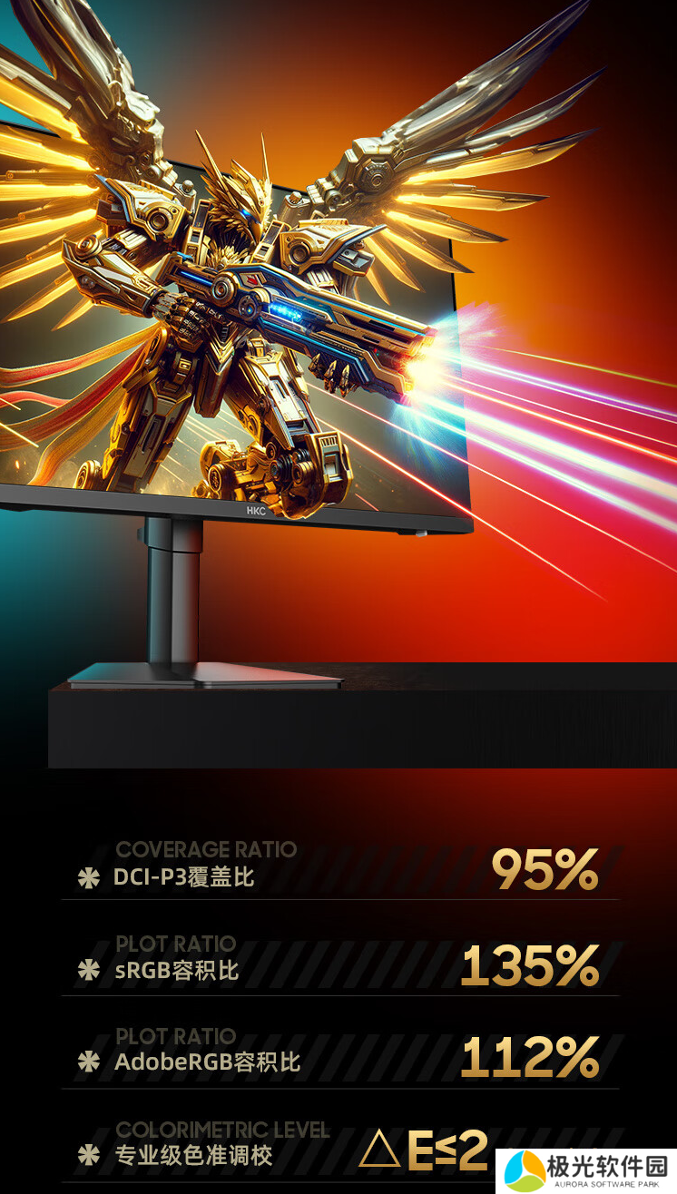 该款显示器提供 HDR 400 高动态解析功能,支持 95% DCI-P3 色域覆盖、135% sRGB / 112% Adobe RGB 容积比。显示器色准 ΔE≤2(平均值),同时支持色域缩限功能。