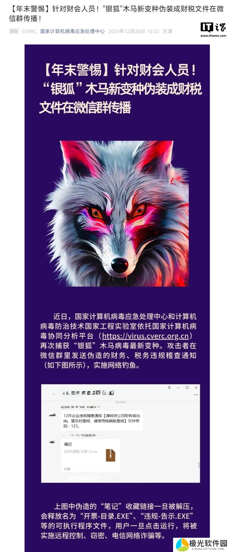 本站 12 月 20 日消息,国家计算机病毒应急处理中心今日宣布,与计算机病毒防治技术国家工程实验室依托国家计算机病毒协同分析平台在我国境内再次捕获发现针对我国用户的“银狐”(本站注:又名“游蛇”、“谷堕大盗”)木马病毒的最新变种。