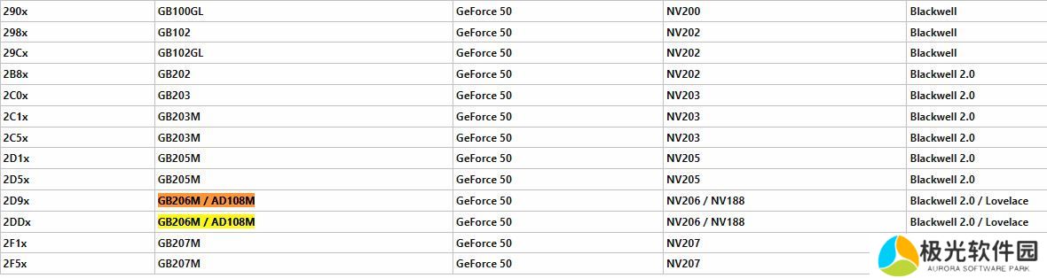 根据 Techpowerup 数据库显示,GB206M、GB205M、GB203M、GB202 和 GB203 都属于 Blackwell 2.0 架构。