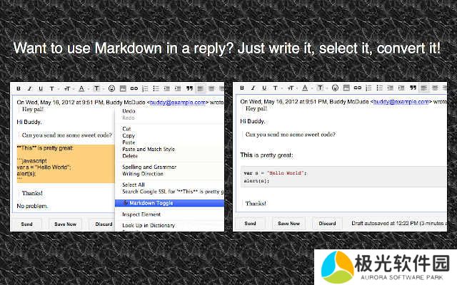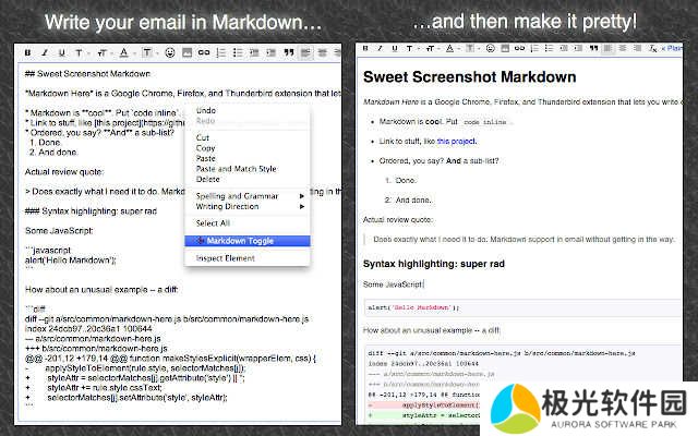 Markdown Here插件是一款非常实用的浏览器扩展工具,它允许用户将Markdown格式的文本转换为富文本样式,核心功能是将Markdown格式的文本转换为HTML格式的富文本。用户只需在支持Markdown的编辑器中编写内容,然后点击插件图标或使用快捷键,即可将文本转换为格式丰富的HTML内容。