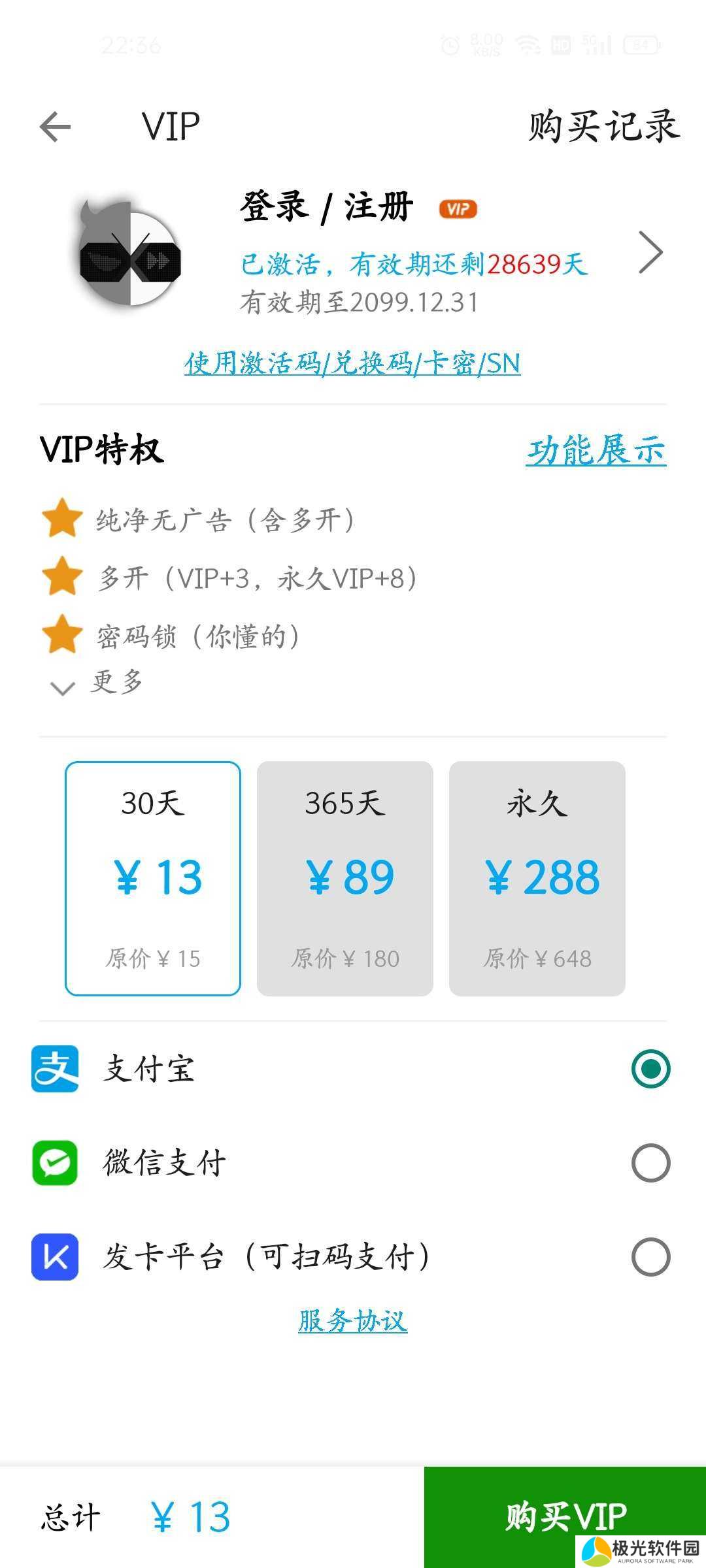 付费,是通过SN码的方式进行激活的(在用微信/支付宝方式购买时),会自动激活。因此,找回丢失的权限,也就是需要找回这个SN码。见下图: