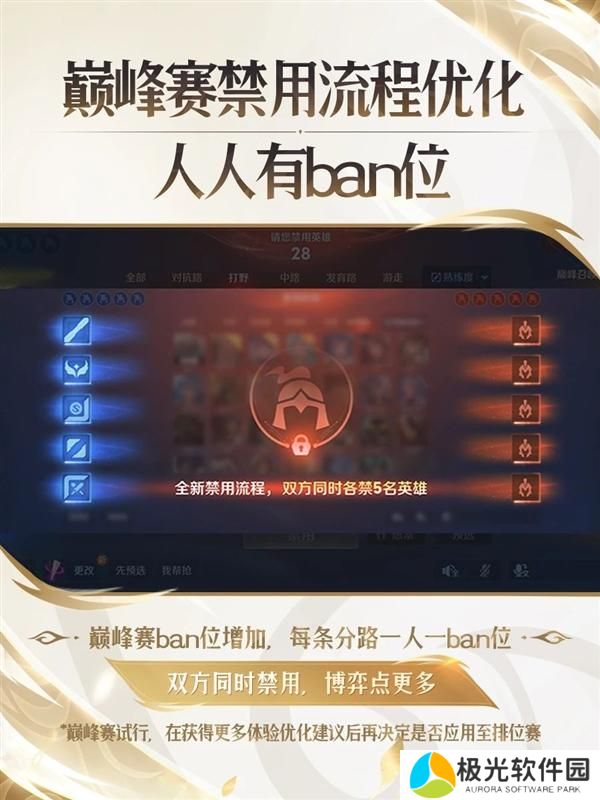 S37赛季的另一项重大调整是BP流程的升级。巅峰赛的Ban位将从原有的6个增加至10个。待收集更多体验优化建议后,再决定是否将其应用至排位赛。