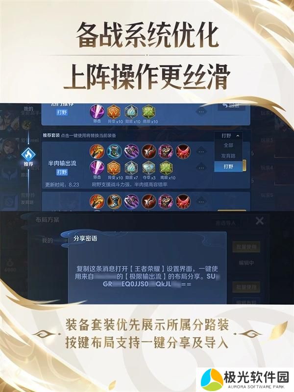 同时,备战系统也得到了优化。装备套装将优先展示所属分路装,按键布局支持一键分享及导入,方便玩家快速设置。