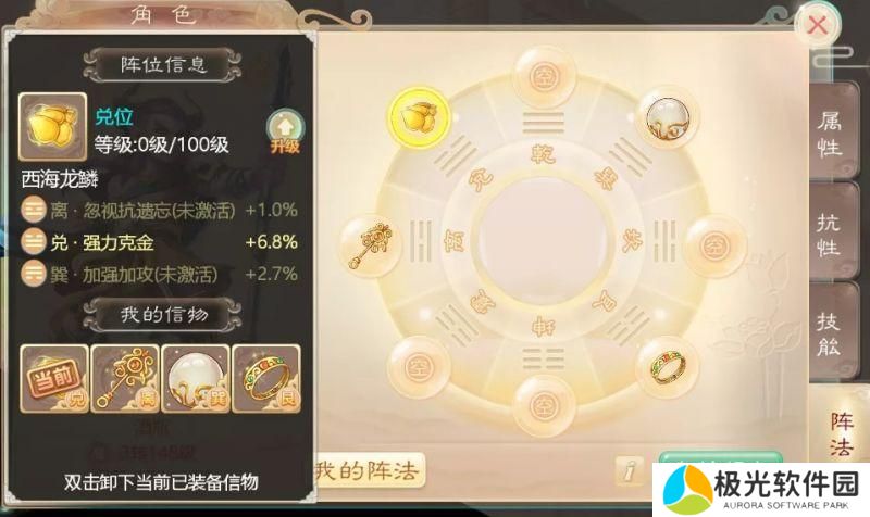 每个卦位只能摆放一个信物,激活一条信物属性。