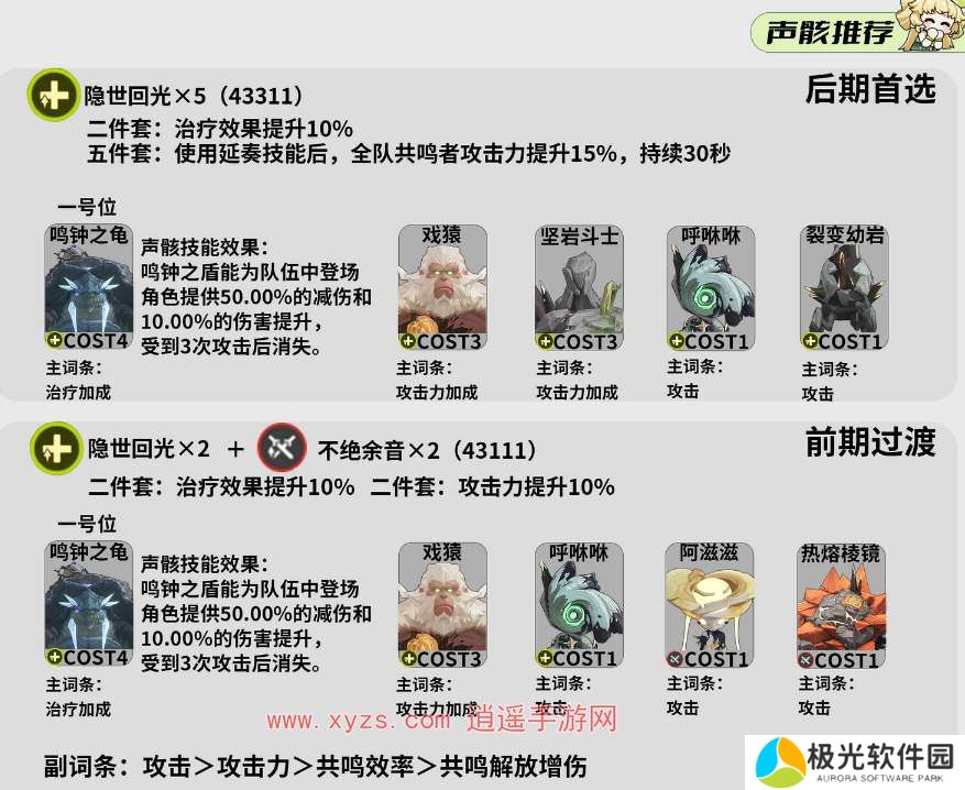 早期强烈推荐2避世回光+2绵绵不绝余音。中后期最好是选择避世回光5套装,为队友提供更好的增益值。