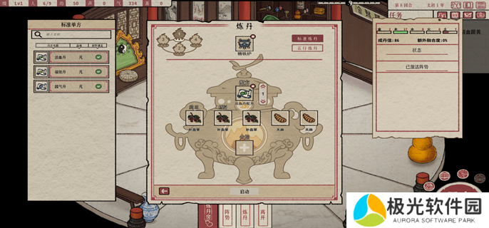 炼丹炉:游戏中的炼丹炉有两种炼丹方式,即标准炼丹和五行炼丹。不需要特定的配方,只要材料放对,就有可能炼制出金灵丹。