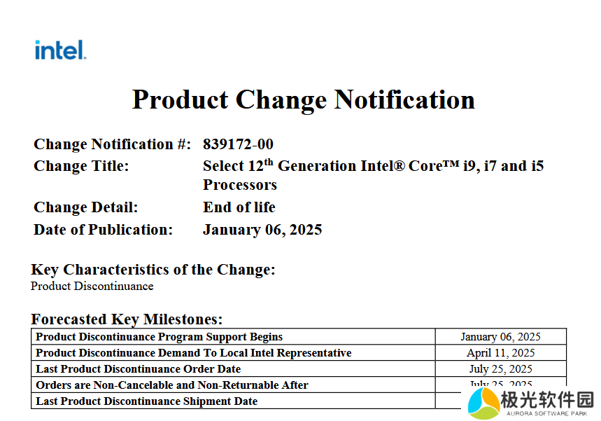 英特尔通告显示,将于 4 月 11 日向当地代表提出产品停产要求,大多数OEM 厂商的 Alder Lake 移动 CPU 供货日期将于7 月 25 日截止,最后一批产品的停止出货日期为2026 年 1 月 23 日。