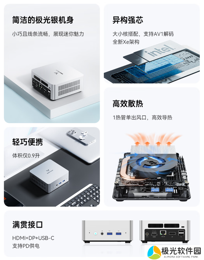 据介绍,铭凡 UN1250 迷你主机采用极光银配色设计,容积0.9升,尺寸为127×54.7×127.5mm。主机搭载 12核 16线程英特尔酷睿 i5-1250P处理器,采用单风扇散热,可选16 / 32GB DDR4 RAM、500GB / 1TB PCIe 4.0 SSD。