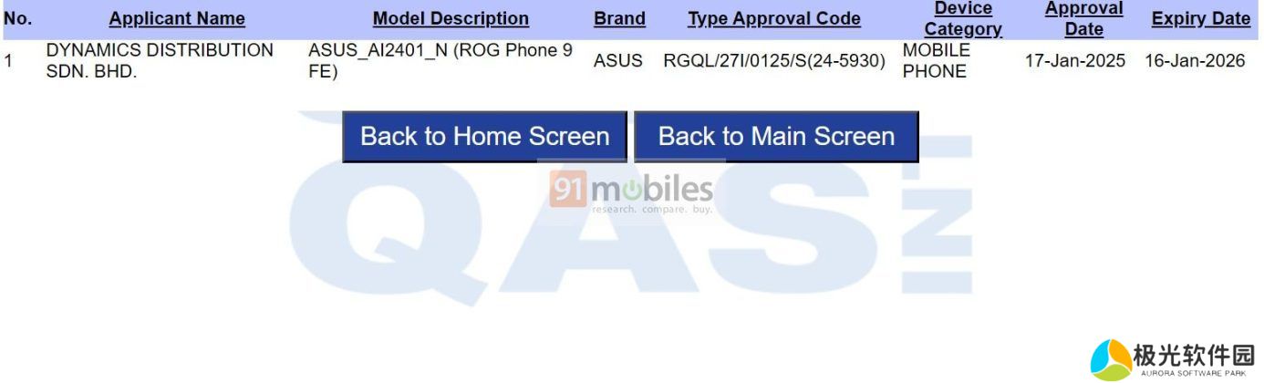 91Mobiles发现,华硕 ROG游戏手机 9 FE机型已经通过了马来西亚 SIRIM 认证和泰国 NBTC 认证,而此前也曾出现在 GSMA 数据库以及 W-iFi 联盟数据库中。