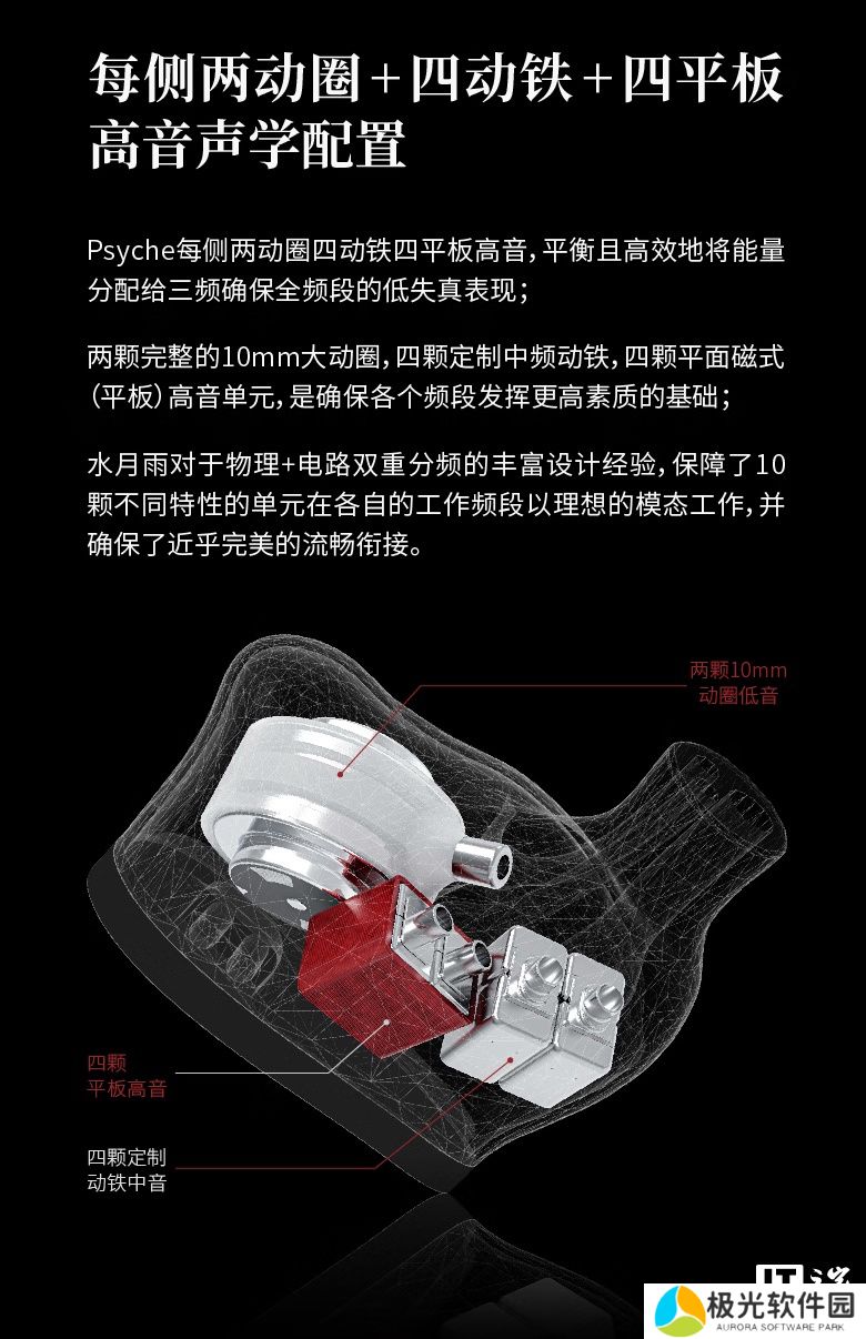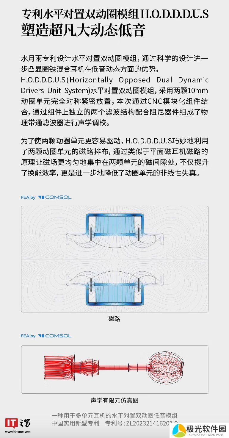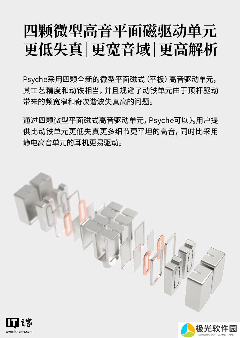 此外,该耳机在动圈单元部分使用“创新水平对置双动圈模组”,官方称通过 CNC 模块化组件结合两颗动圈单元,并在组件上设置了两个独立的滤波结构配合阻尼器以完成声学**。同时“水平对置双动圈模组”技术也可以让两颗动圈单元产生的磁场更均匀地集中在两颗单元的缝隙间隙处,提升换能效率的同时降低失真。