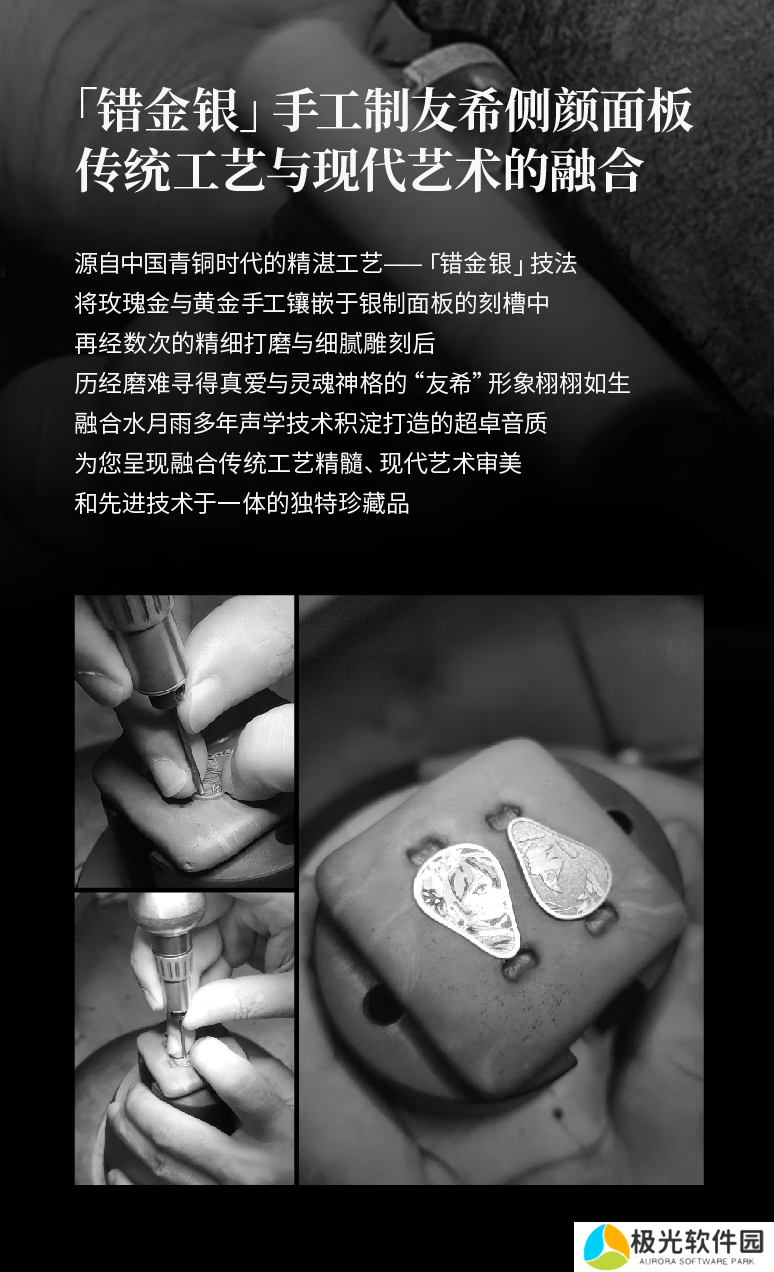 据介绍,这款耳机面板印有水月雨“水月友希”品牌形象,号称采用了传统手工技法“错金银”工艺,将玫瑰金与黄金镶组成相应图案嵌在耳机银质面板上。