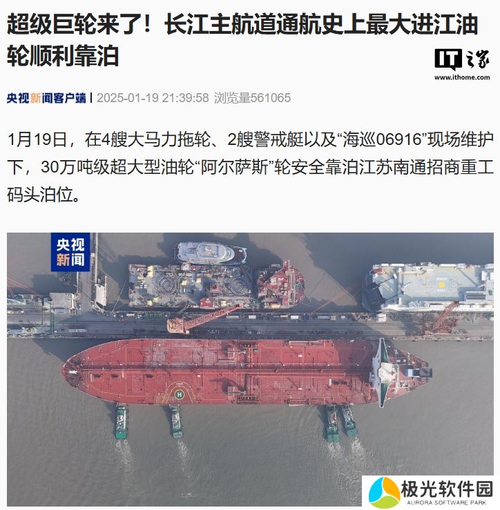 本站 1 月 19 日消息,据央视新闻今日报道,在 4 艘大马力拖轮、2 艘警戒艇以及“海巡 06916”现场维护下,30 万吨级超大型油轮“阿尔萨斯”轮今日安全靠泊江苏南通招商重工码头泊位。
