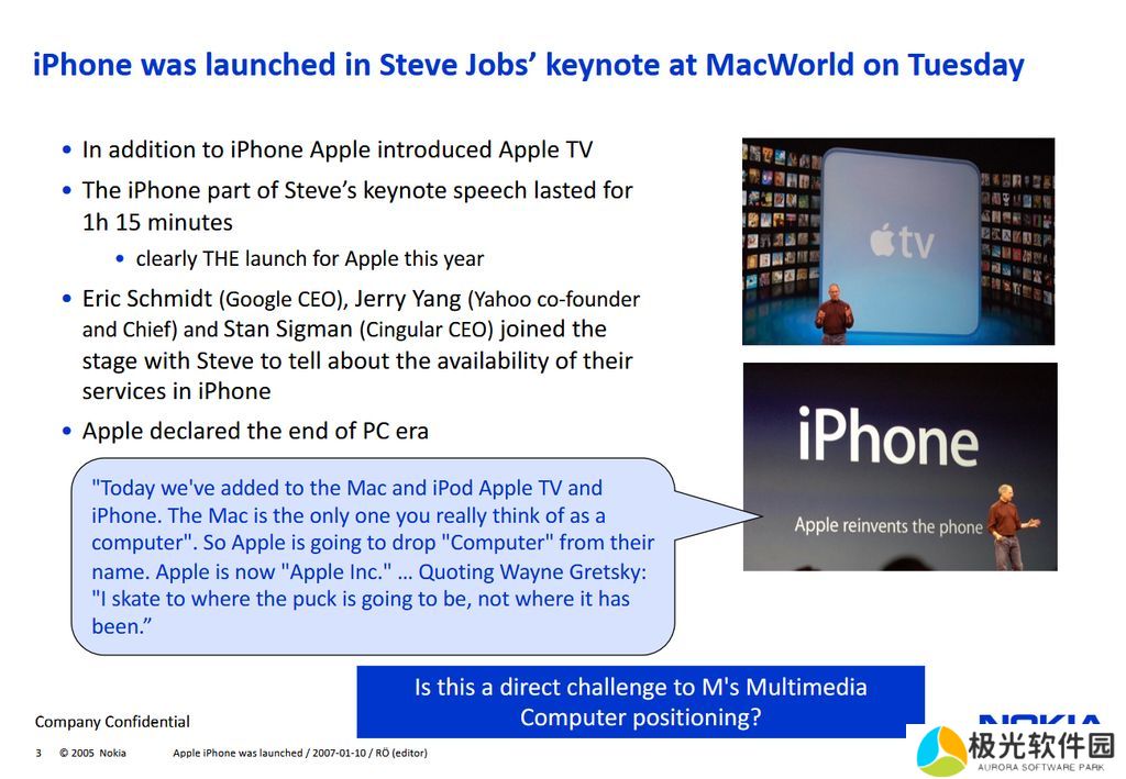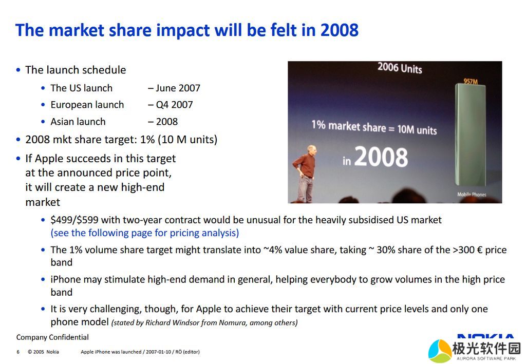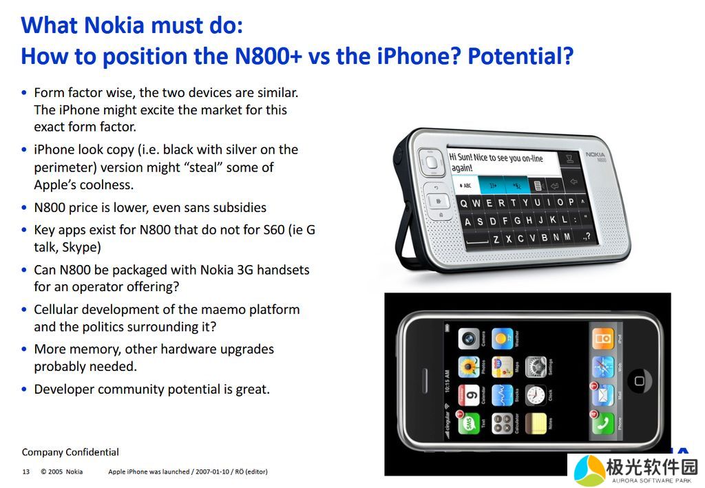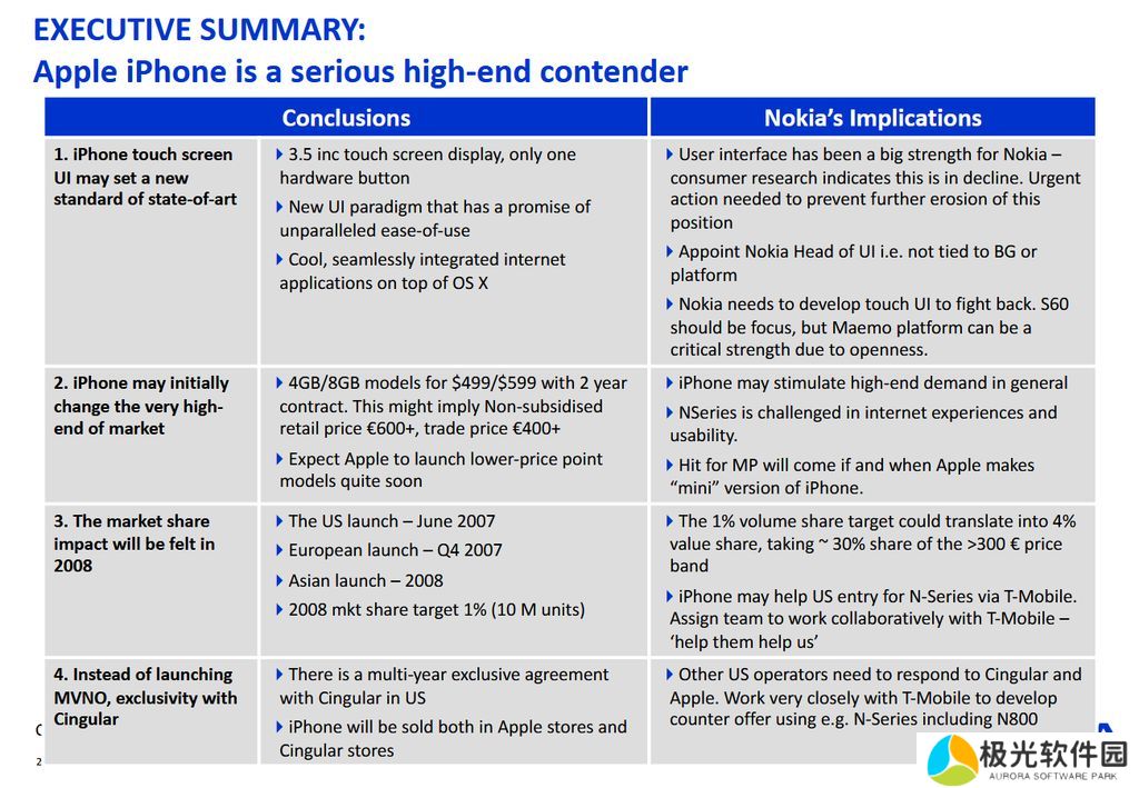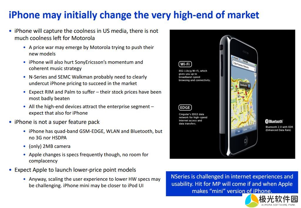 而诺基亚的一个九人团队在 iPhone 发布后的第二天就提交了一份内部报告,预见了这一趋势。报告摘要指出:苹果 iPhone 是一款高端竞争产品,其触摸屏 UI 可能会树立新的行业标杆,此外全新的 UI 范式带来了前所未有的易用性,以及流畅集成的互联网应用程序。