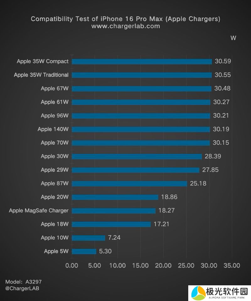 ChargerLAB 在 2024 年实测,发现苹果 iPhone 16 Pro 机型最大持续充电速度约为 30W,不过使用 Apple 的 140W USB-C 电源适配器测试时,峰值充电速度可达 37W,但持续时间未知。