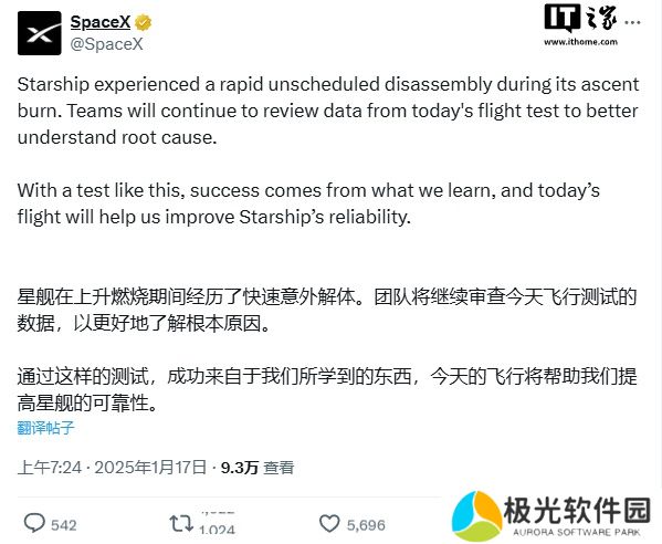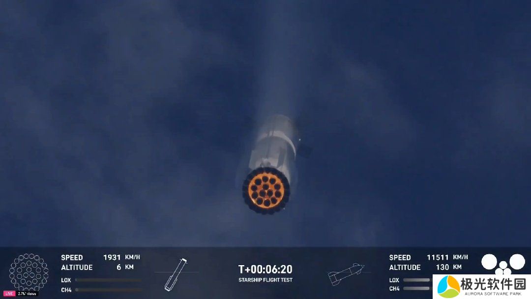 虽然超重型助推器成功回收,但火箭的上面级部分(本站注:也就是“星舰”本体)在飞行仅 8.5 分钟后就发生异常,遥测信号丢失,经确认是在升空过程中解体,没能释放模拟卫星,SpaceX 将在未来几天内发布进一步的分析数据。