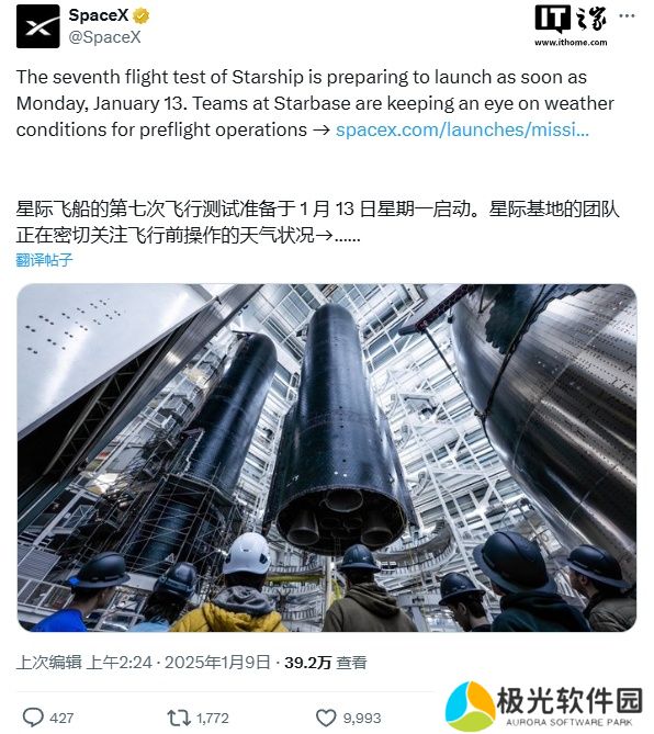 本站 1 月 9 日消息,SpaceX 今天宣布,其目标是在北京时间下周二(1 月 14 日)06:00 开启星舰第七次试飞任务(IFT-7)。