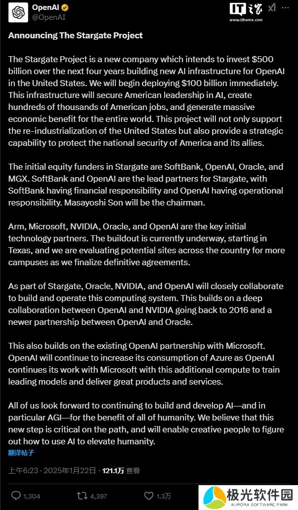 本站 1 月 22 日消息,今日,OpenAI、软银等科技巨头宣布加入全新的“星际之门”(Stargate)合资项目。