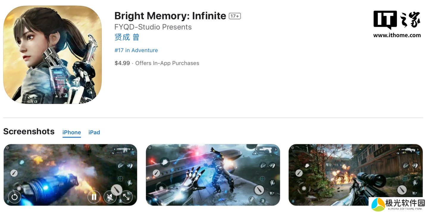本站 1 月 18 日消息,飞燕群岛工作室旗下国产射击游戏《光明记忆:无限》手游版已正式登陆iOS及安卓平台,采用买断制销售,国区定价为20元,美区定价为4.99 美元(本站备注:当前约 36.6 元人民币)。