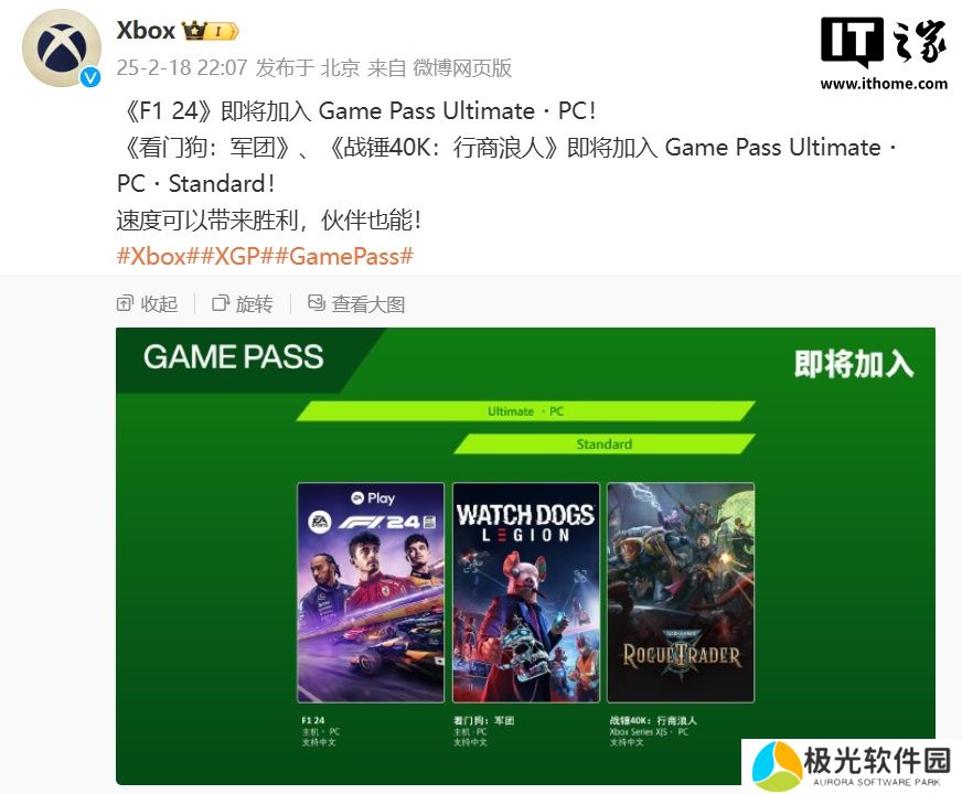 本站 2 月 18 日消息,微软 Xbox 官方今日公布了三款将加入XGP 服务的游戏,包括《看门狗:军团》《F1 24》《战锤 40K:行商浪人》。