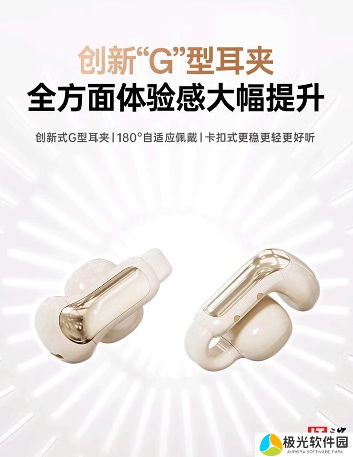 这款耳机采用 G 型耳夹设计,号称拥有沉浸式全景音声场,耳桥结构支持拉伸,可贴合耳形降低漏音。