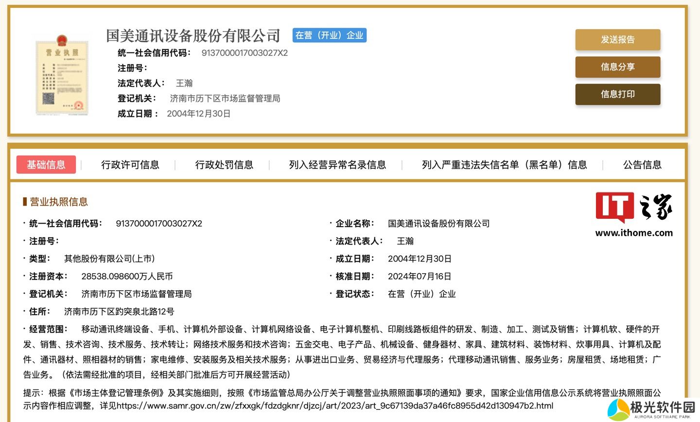 本站查询国家企业信用信息公示系统,国美通讯设备股份有限公司于 2004 年 12 月 30 日成立,法定代表人为王瀚,注册资本为 28538.098600 万人民币。