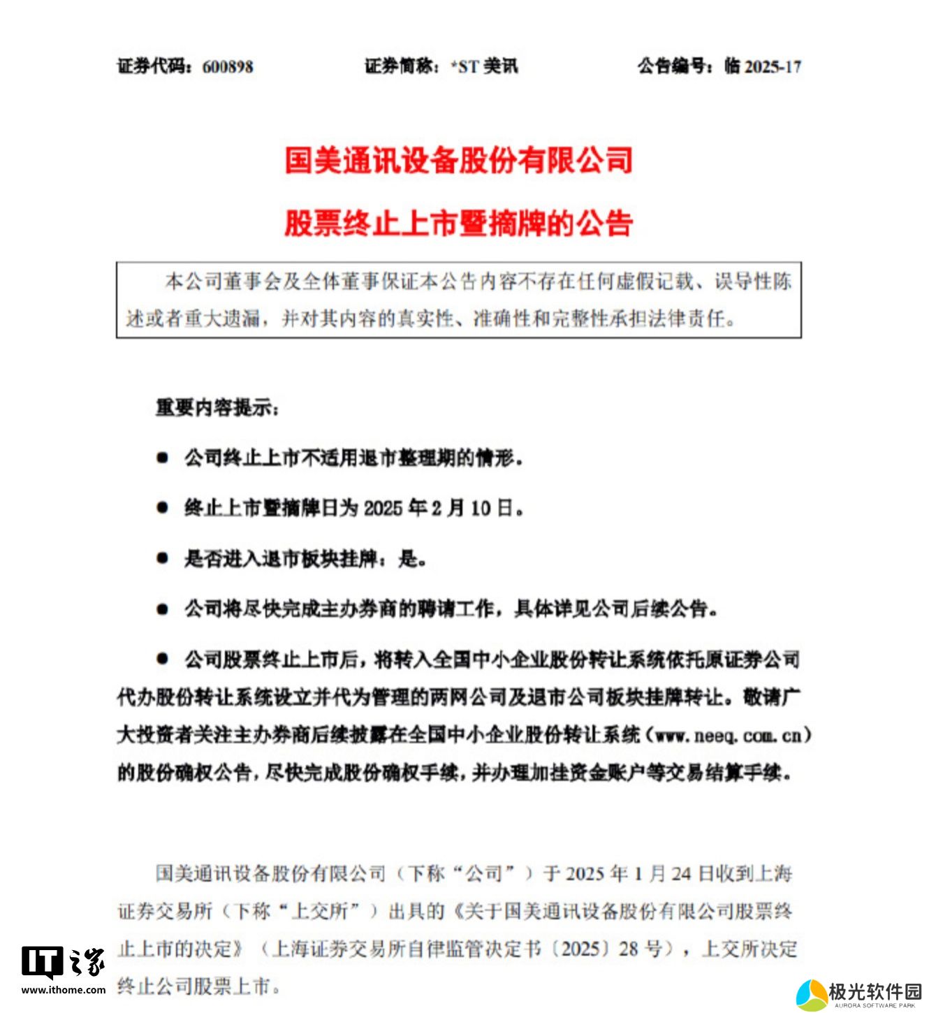 本站 1 月 27 日消息,国美通讯设备股份有限公司(ST 美讯)于 1 月 26 日发布公告称,公司于 1 月 24 日收到上交所终止上市决定。