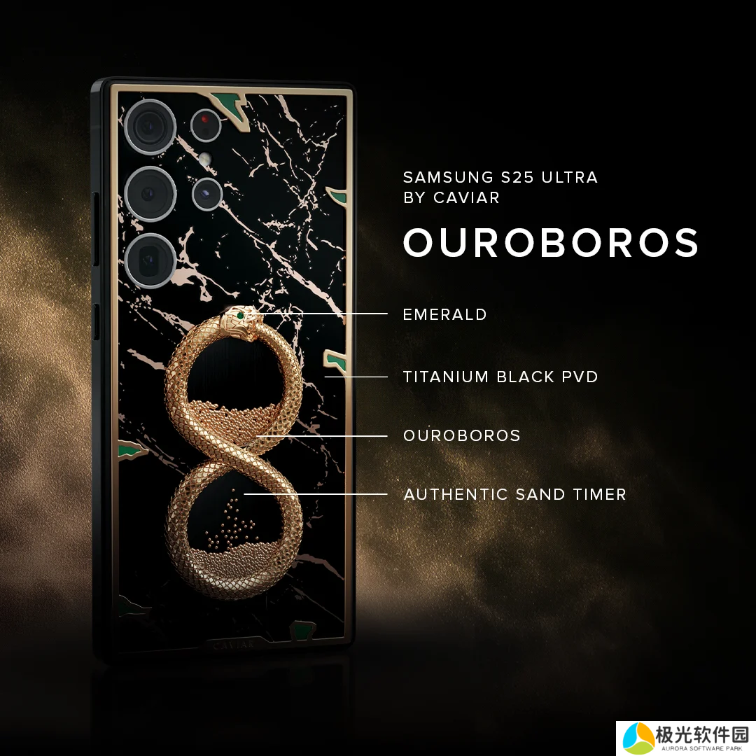 官方表示,三星 Galaxy S25 Ultra Ouroboros 是艺术与科技完美融合的典范。其设计特色包括一个由 999 纯金打造的三维 ouroboros,围绕着手机机身内嵌的沙漏,沙漏内流动着金色颗粒,象征着时间的流逝与无尽的更新。这款奢华手机还配有钛合金面板,采用光滑的黑色 PVD 涂层和精美金色雕刻,兼具坚固与优雅。