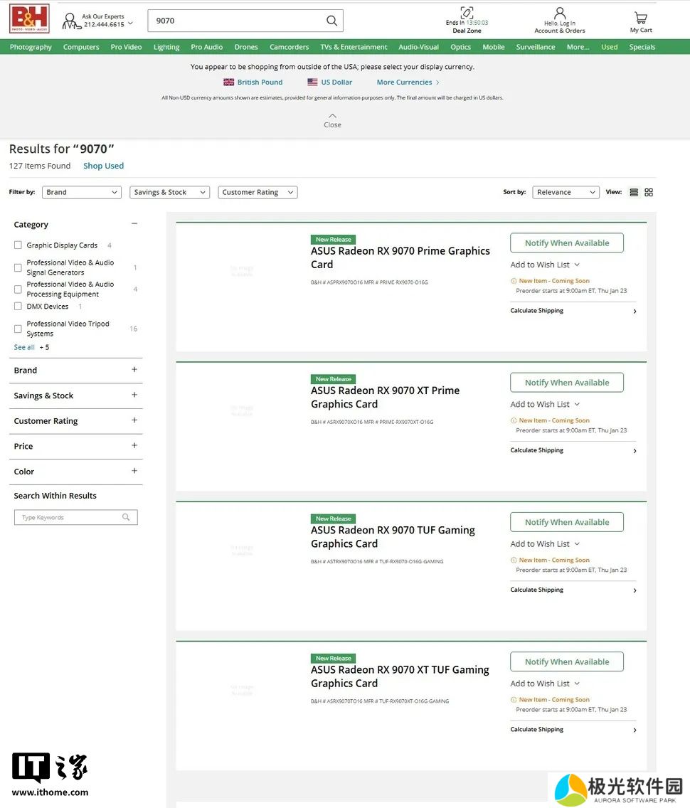 B&H 上总共列出了四款华硕显卡:RX 9070 Prime、RX 9070 TUF Gaming、RX 9070 XT TUF 和 RX 9070 XT Prime。