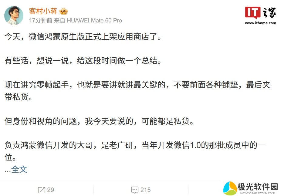 腾讯 WXG(微信事业群)员工 @客村小蒋 今日发布长文总结了微信纯血鸿蒙版 App 上架历程,本站附原文如下: