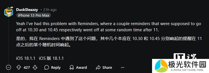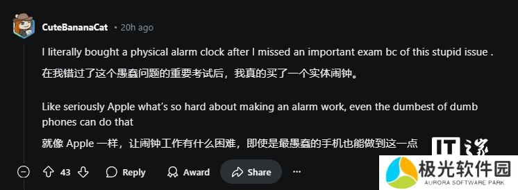 由于数百万用户每天依赖 iPhone 闹钟来提醒自己起床工作或上学,这一故障的影响可能是灾难性的。例如,一位用户提到,由于闹钟未能按时响起,他错过了一场重要考试,并决定改用实体闹钟以避免类似情况再次发生。此外,其他 Reddit 用户还反映,内置的“提醒事项”应用也存在任务未能按时提醒的问题,这表明故障不仅限于苹果的“时钟”应用。