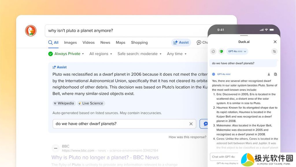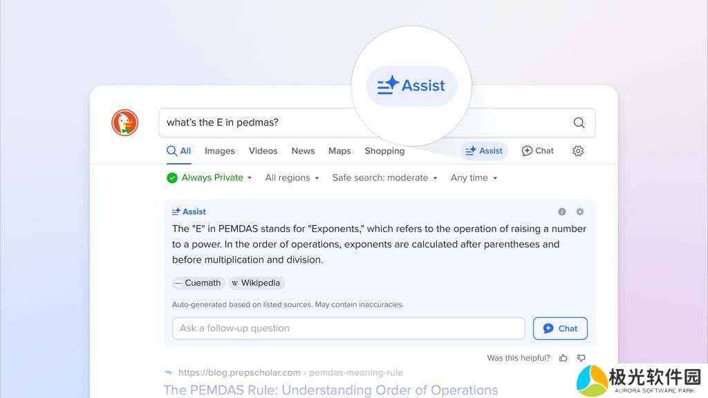 DuckDuckGo 搜索引擎的 AI 功能名为“Assist”,于 2023 年首次推出,经过近 2 年的测试后现已告别 Beta 测试。与 Google 的 AI Overview 类似,Assist 在搜索结果上方提供 AI 生成的摘要。