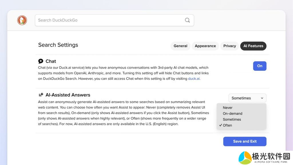 本站 3 月 7 日消息,Spread Privacy 官网昨日(3 月 6 日)发布公告,宣布 DuckDuckGo 搜索引擎的 AI 功能已告别 Beta 测试阶段,现已正式上线,用户可自由选择是否启用 AI 辅助搜索和聊天功能。