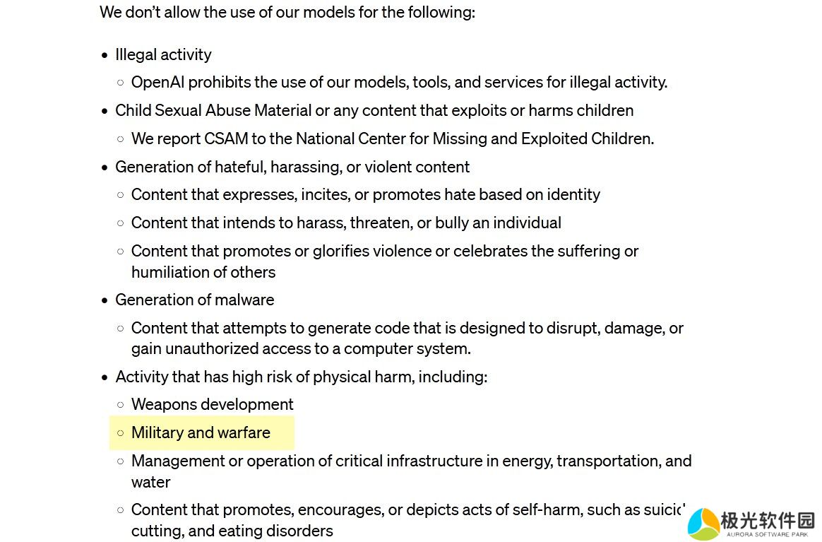OpenAI 方面还表示,该公司明确禁止将其技术用于开发或使用武器,或使某些可能危及人身安全的系统自动化。