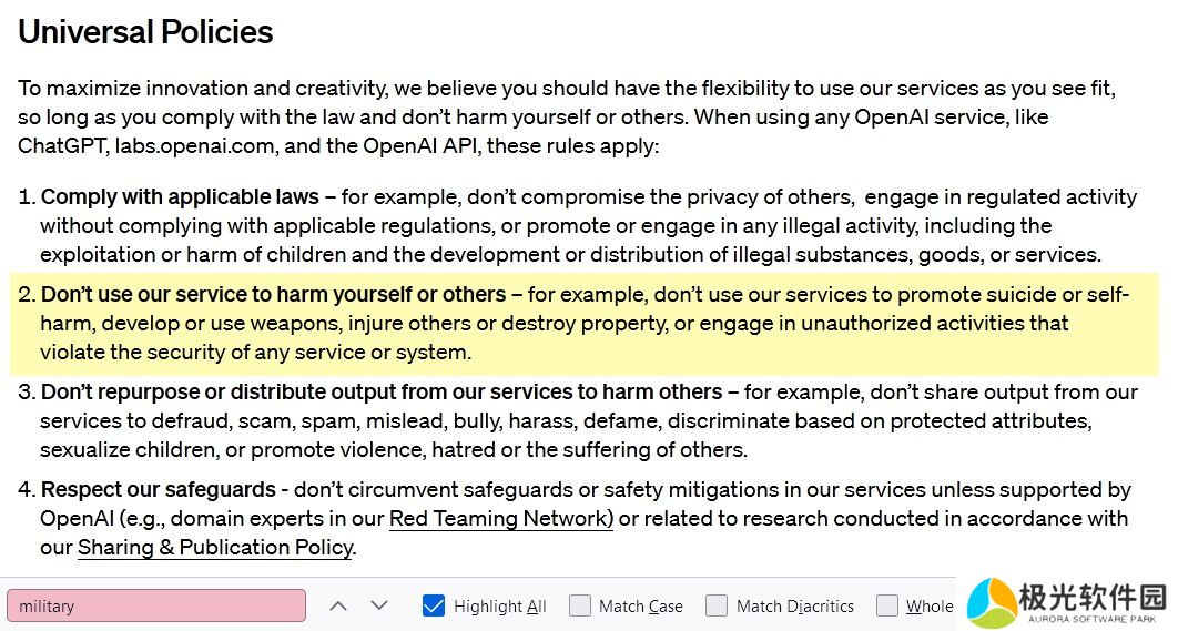 新政策保留了不得“使用其服务伤害自己或他人”的禁令,并以“开发或使用武器”为例,但“军事和战争”这个更全面的禁令已经不复存在。