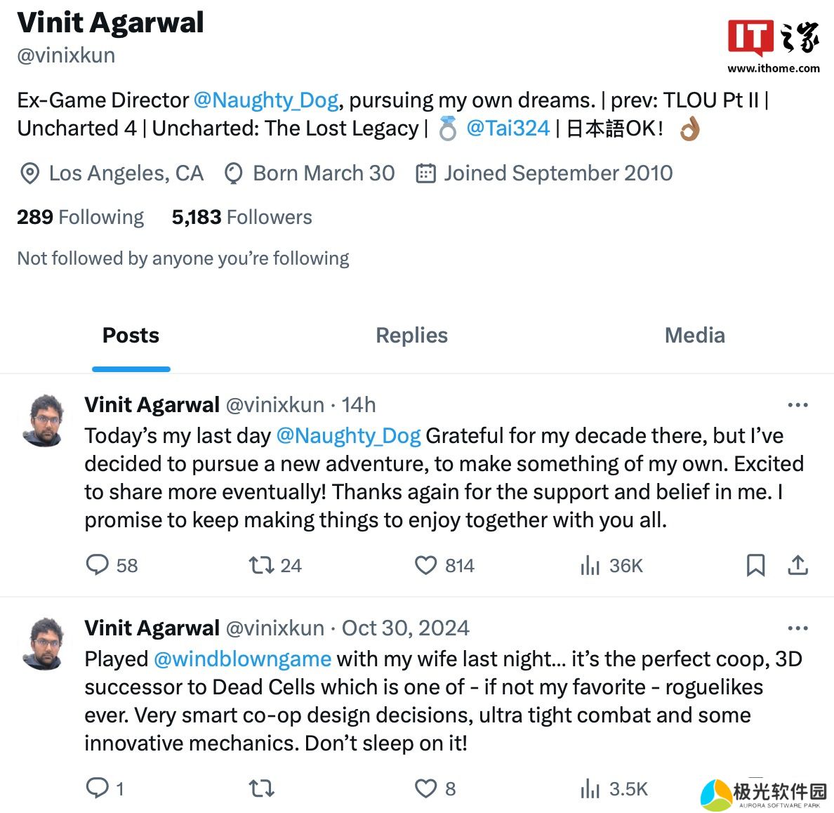 本站 1 月 11 日消息,顽皮狗游戏总监 Vinit Agarwal 今日在 X 平台发文,宣布其已从顽皮狗离职。