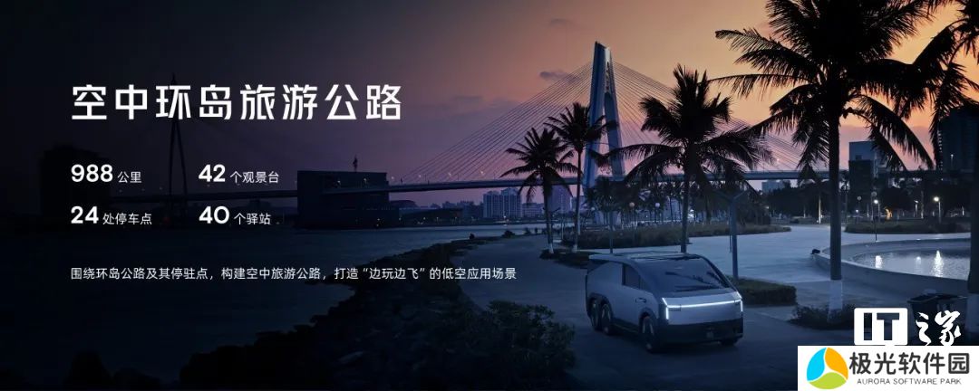 2.示范应用阶段:打造全长近 1000 公里的国内首条飞行汽车“空中环岛旅游公路”,沿线规划 42 个观景台、24 个停车点、40 个驿站。